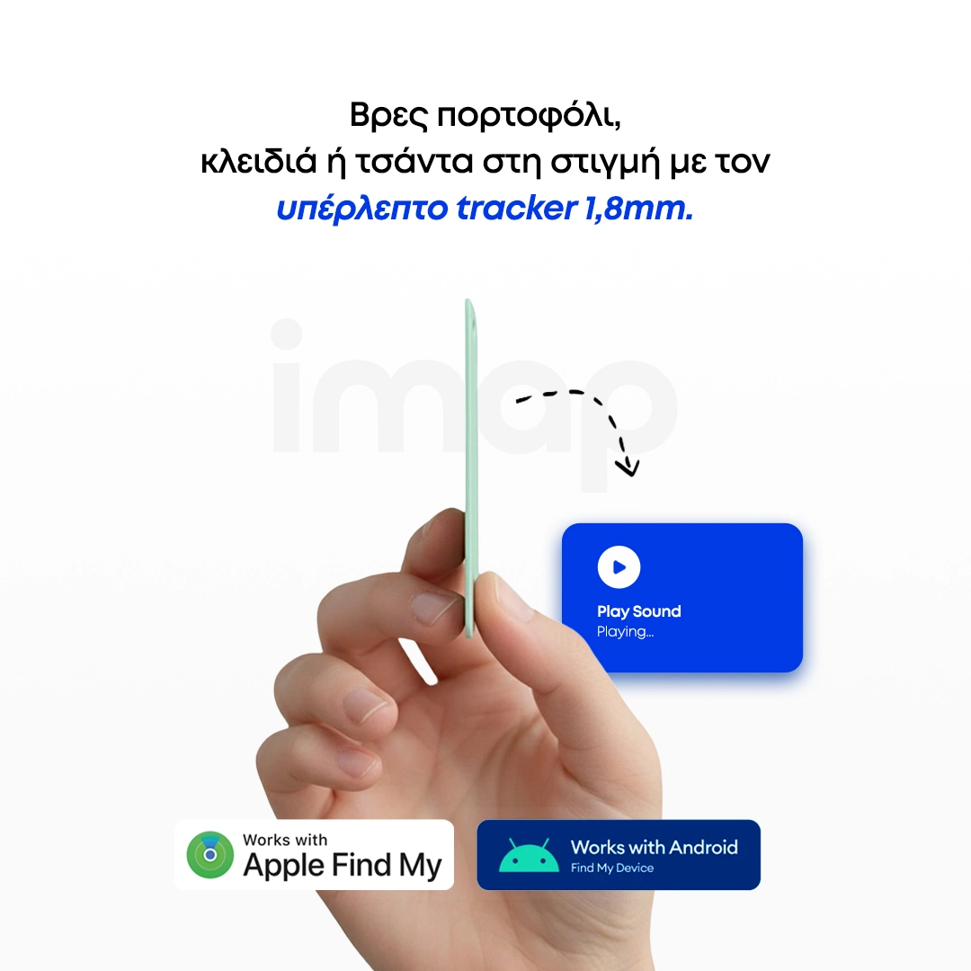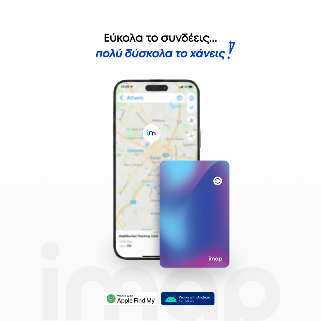 Μην ξαναχάσεις ποτέ το πορτοφόλι σου αλλά όχι μόνο αυτό. Τα κλασσικά tags όπως το Airtag είναι εξαιρετικά χρήσιμα αλλά το σχήμα τους δεν τους επιτρέπει να μπουν στο πιο χρήσιμο ίσως αντικείμενο καθημερινής χρήσης όλων μας, το πορτοφόλι. Το imap ήρθε για να λύσει αυτό το πρόβλημα μια για πάντα με μοναδικό τρόπο. Έχεις σκεφτεί την ταλαιπωρία που ακολουθεί το να χάσεις το πορτοφόλι σου; Επανέκδοση ταυτότητας, διπλώματος, δηλώσεις στην αρχές για την απώλειά τους και η λιστά δεν τελειώνει εκεί. Σκέψου λοιπόν πόσο χρόνο και ταλαιπωρία μπορεί να σου γλυτώσει μια τόσο μικρή αλλά τόσο έξυπνη επένδυση όπως το imap. Το παραγγέλνεις σήμερα, το παραλαμβάνεις αύριο και το πορτοφόλι σου είναι πλέον ασφαλές, one less thing to worry about!